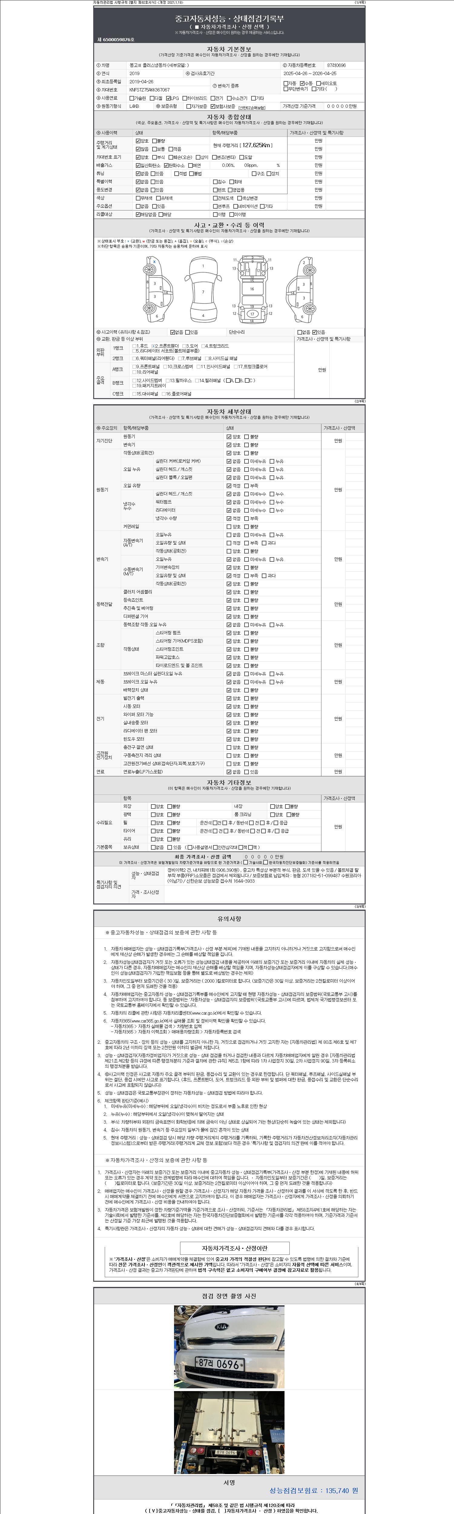 | 주행거리 | 127,625 km | 차량번호 | 87러0696 | 사고유무 | 성능기록부 참조 | 제시번호 | 제 2147483647 호 |