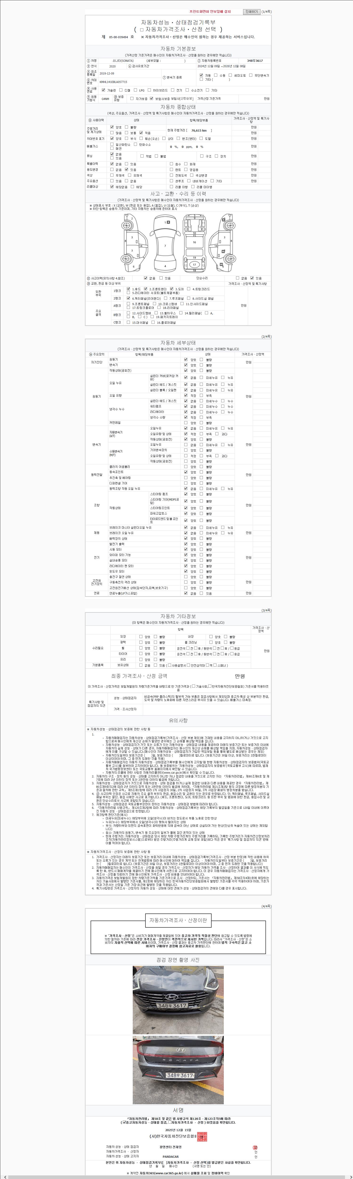 | 주행거리 | 76,615 km | 차량번호 | 348우3617 | 사고유무 | 성능기록부 참조 | 제시번호 | 제 2147483647 호 |