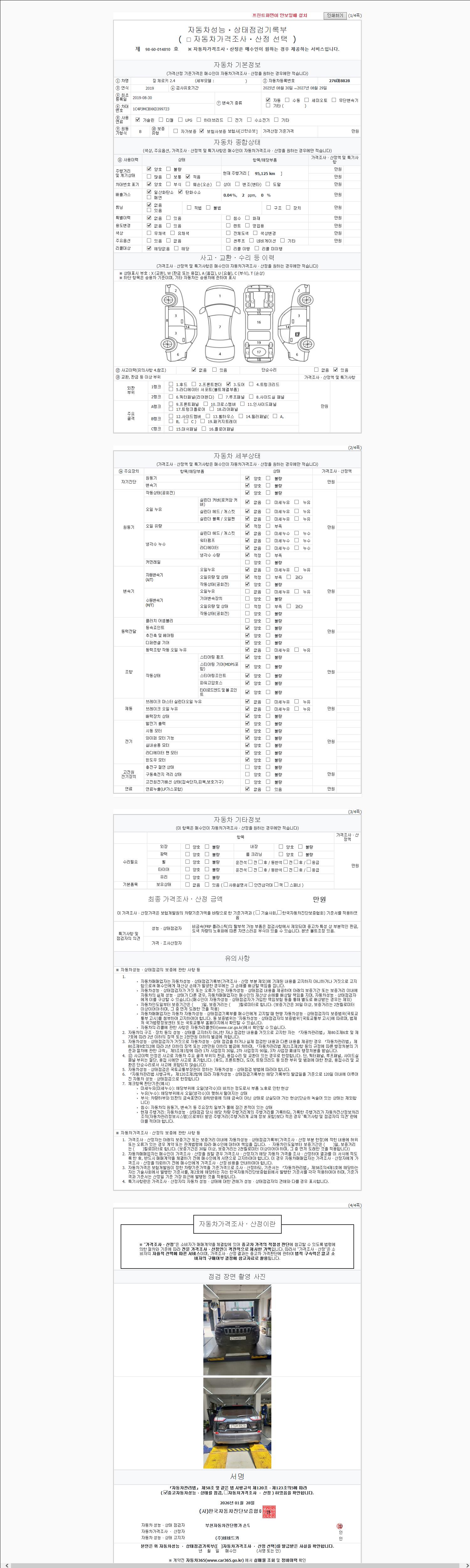 | 주행거리 | 95,125 km | 차량번호 | 276머8828 | 사고유무 | 성능기록부 참조 | 제시번호 | 제 2026030838 호 |